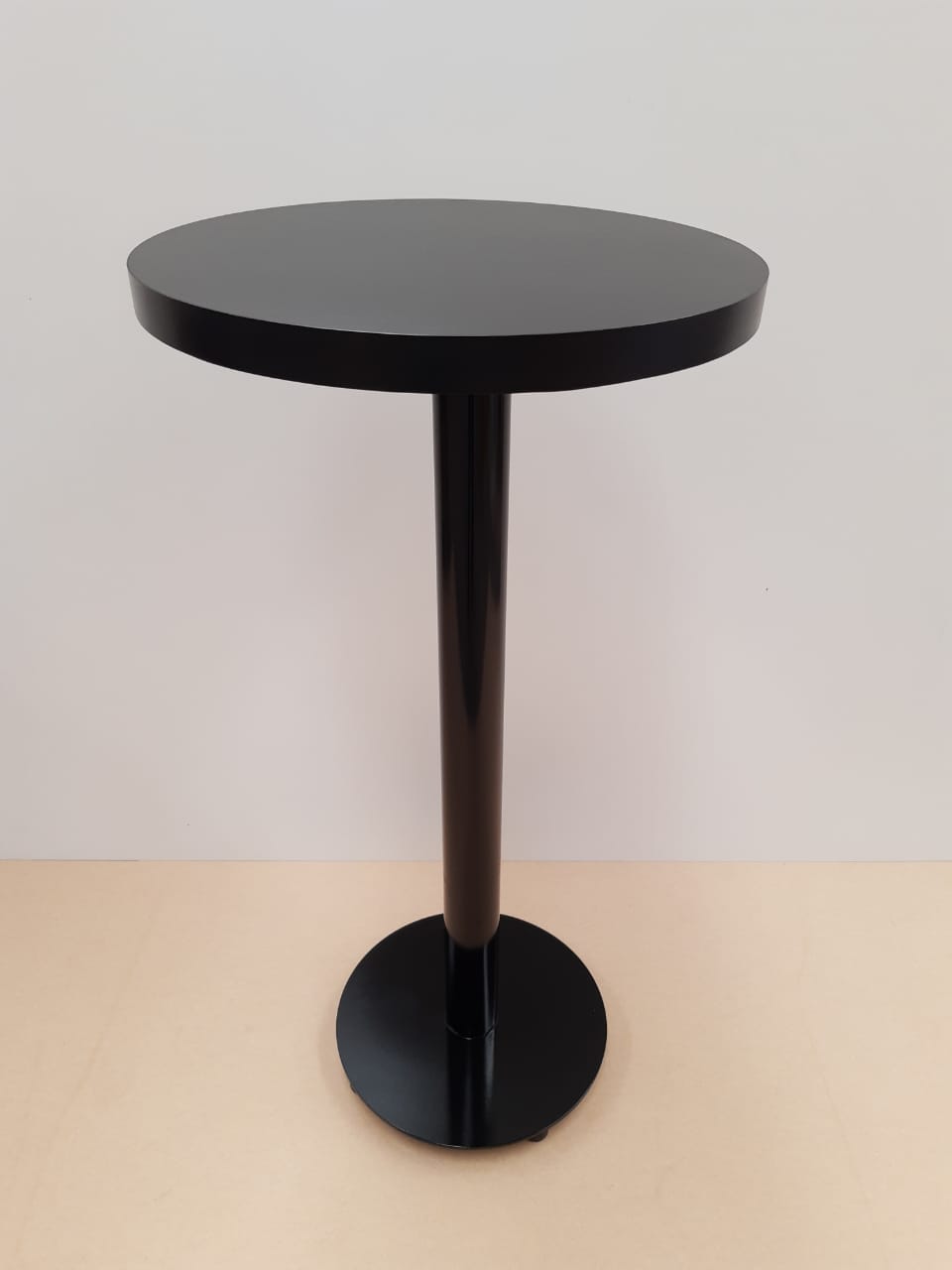Mesa com estrutura metálica com pintura epóxi preto com tampo circular em MDF preto ou madeirado, granito ou travertino